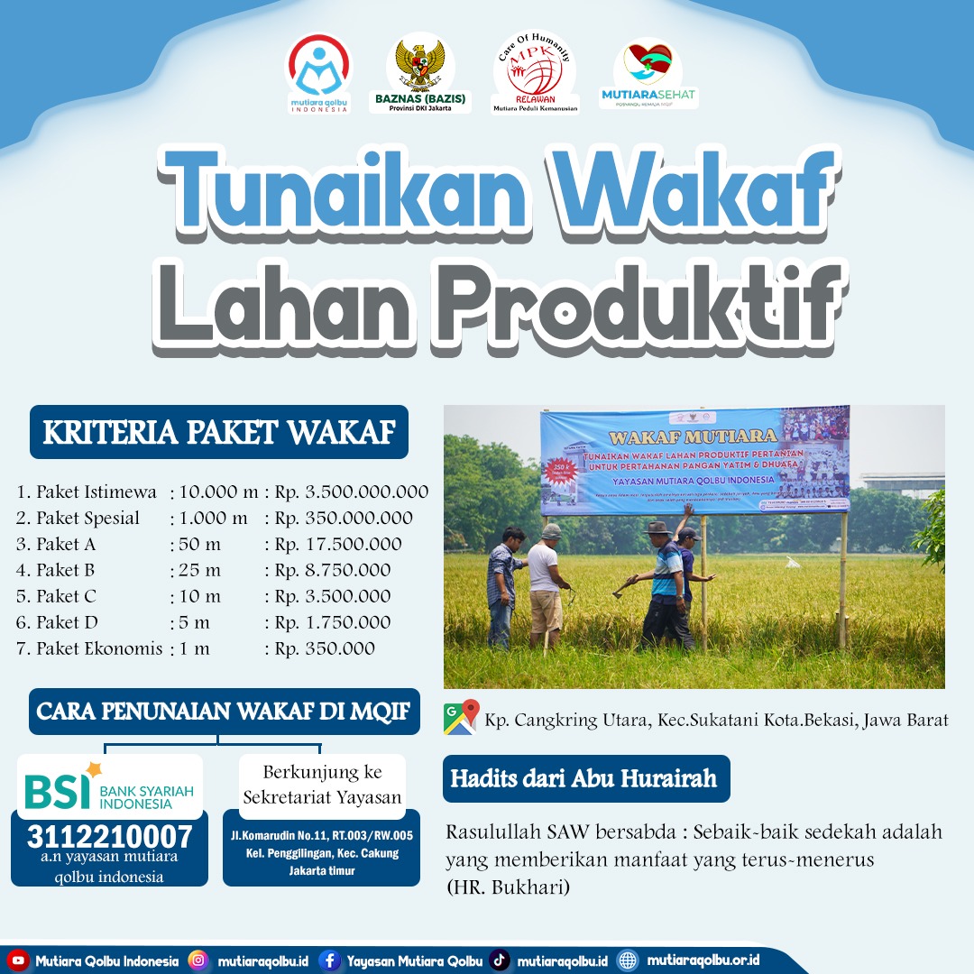Wakaf telah lama menjadi salah satu instrumen keuangan Islam yang memiliki dampak besar dalam membangun kesejahteraan umat. Salah satu bentuk wakaf yang kini semakin relevan di tengah tantangan ekonomi dan sosial adalah wakaf lahan produktif pertanian. Yayasan Mutiara Qolbu Indonesia mengambil inisiatif mulia dengan mengembangkan program wakaf lahan produktif untuk mendukung ketahanan pangan, khususnya bagi anak yatim dan dhuafa.